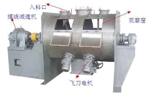 臥式犁刀混合機(jī)啟動(dòng)后犁刀由犁刀軸帶動(dòng)旋轉(zhuǎn),使物料沿筒體徑向作周向湍動(dòng),同時(shí)把物料沿犁刀兩側(cè)面的法線方向拋出。當(dāng)被拋出和作周向湍動(dòng)的物料流經(jīng)飛刀組時(shí),被高速旋轉(zhuǎn)的飛刀迅速、有力地拋散。物料在上述犁刀和飛刀的復(fù)合作用下,不斷疊、擴(kuò)散、在短時(shí)間內(nèi)達(dá)到均勻混合,混合精度高。